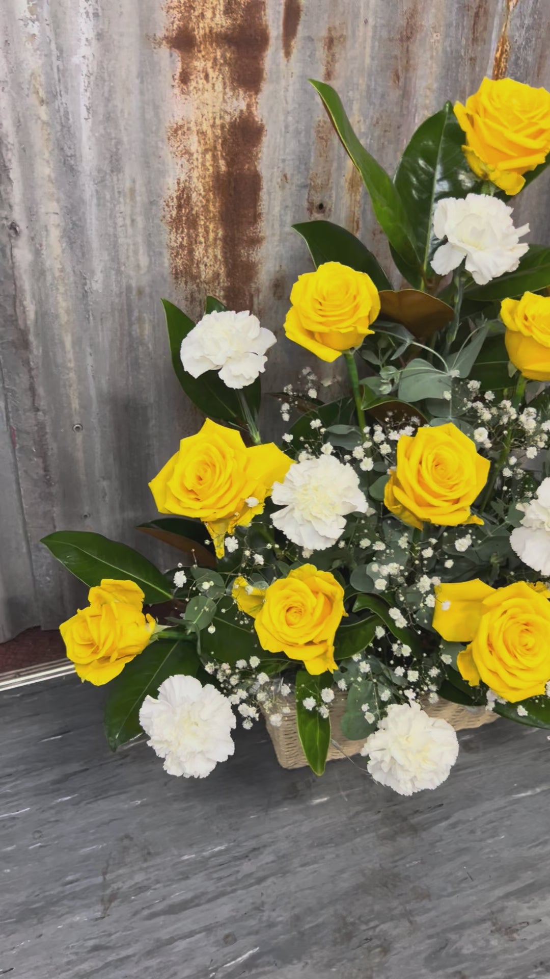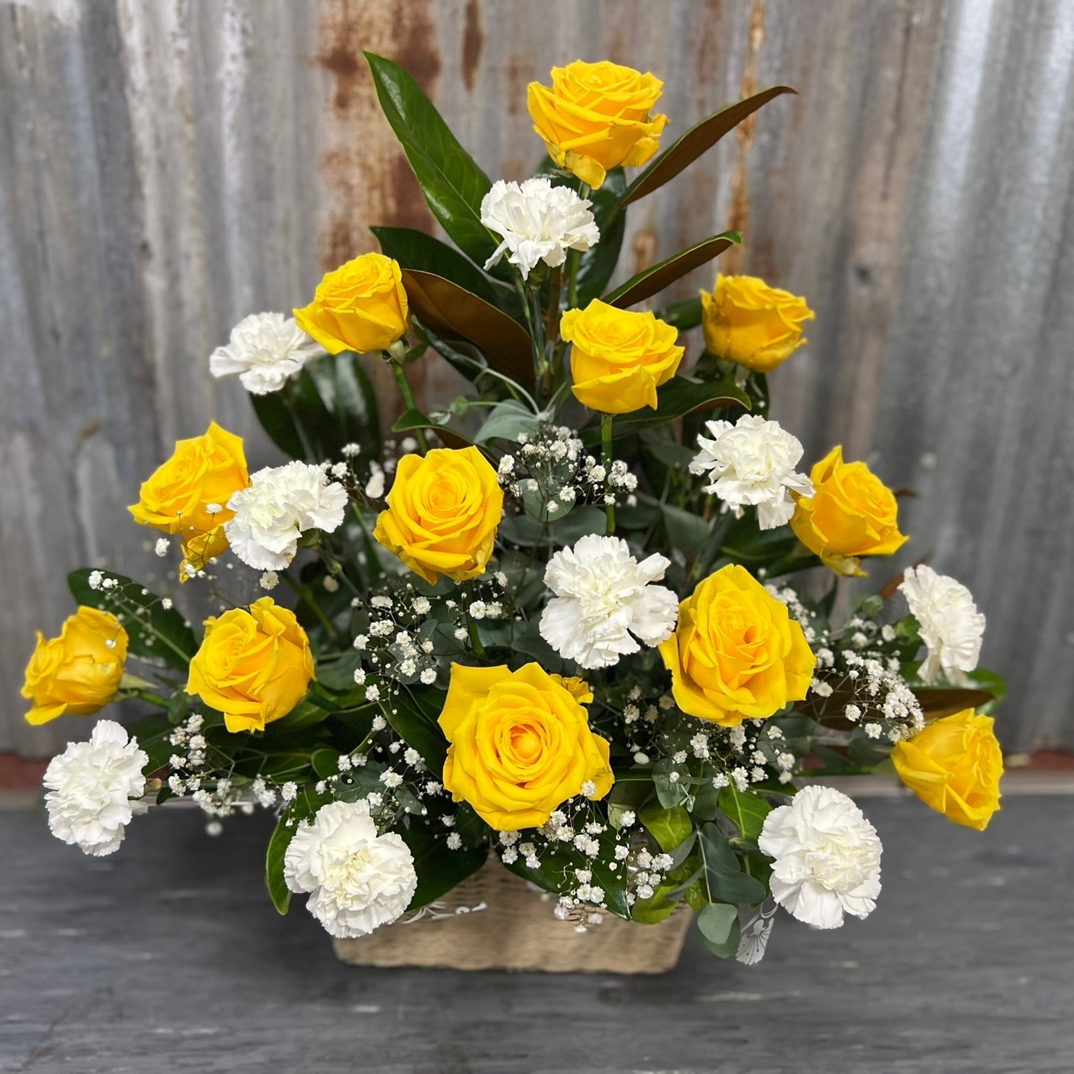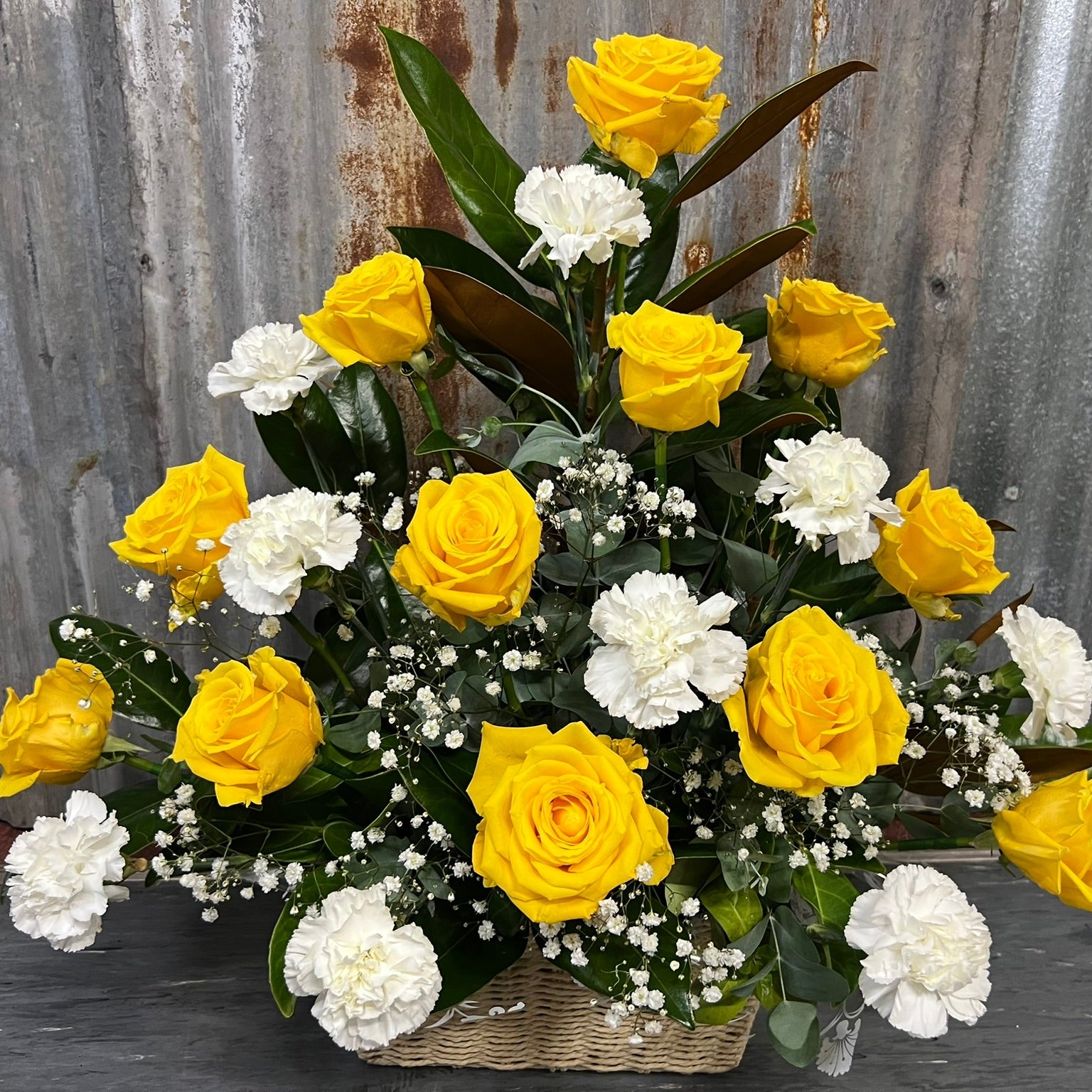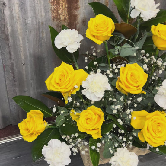 Let our experienced florist design something truly special with Morning Glory — a radiant arrangement of golden yellow roses, crisp white carnations, and lush green foliage. Each piece is created fresh and styled with care, using the best seasonal blooms available.
